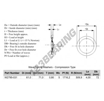 La Arandela Ondulada De Compresión con la referencia WSW-CT-71-61-0.80-5 tiene un diámetro interior de 61 mm, un diámetro exterior de 71 mm y un espesor de 0.8 mm. Está fabricado con el material ACERO.