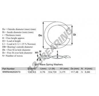 La Arandela Elástica Ondulada Partida con la referencia SWSW-117.48-106.43-0.76-5 tiene un diámetro interior de 106.43 mm y un espesor de 0.76 mm. Está fabricado con el material ACERO.