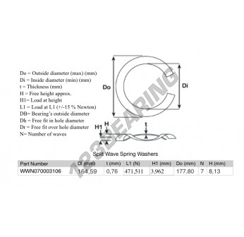 La Arandela Elástica Ondulada Partida con la referencia SWSW-177.80-164.59-0.76-7 tiene un diámetro interior de 164.59 mm y un espesor de 0.76 mm. Está fabricado con el material ACERO.