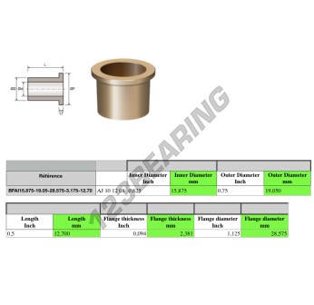 El Casquillo Bronce Con Collarín conocido por la referencia BFAI15.875-19.05-28.575-3.175-12.70 Genérico tiene un diámetro interior de 15.875 mm, un diámetro exterior de 19.05 mm y una longitud de 12.7 mm. Está hecho de .