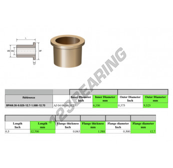 El Casquillo Bronce Con Collarín conocido por la referencia BFAI6.35-9.525-12.7-1.588-12.70 Genérico tiene un diámetro interior de 6.35 mm, un diámetro exterior de 9.525 mm y una longitud de 12.7 mm. Está hecho de .