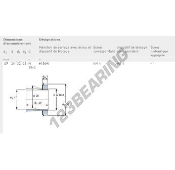 El Manguito, conocido como H304-SKF SKF, tiene un diámetro interior de 17 mm, un diámetro exterior de 32 mm y un espesor de 28 mm.