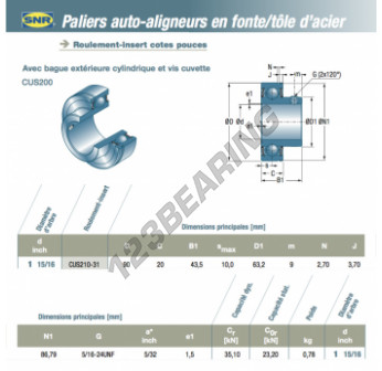 El Accesorio De Cojinete CUS210-31-SNR SNR mide 49.2125 mm de diámetro interior, 90 mm de diámetro exterior y 20 mm de espesor. Está fabricado en .