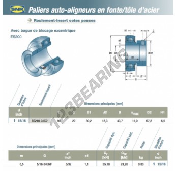 El Accesorio De Cojinete ES210-31-G2-SNR SNR mide 49.2125 mm de diámetro interior, 90 mm de diámetro exterior y 20 mm de espesor. Está fabricado en .