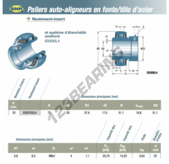 El Accesorio De Cojinete EX207-G2-L4-SNR SNR mide 35 mm de diámetro interior, 72 mm de diámetro exterior y 20 mm de espesor. Está fabricado en .