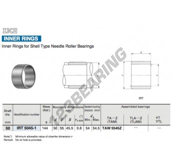 El Aro Interior conocido por la referencia IRT5045-1-IKO IKO tiene un diámetro interior de 50 mm, un diámetro exterior de 55 mm y una longitud de 45.5 mm. Está hecho de .