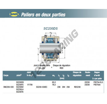 El Accesorio De Cojinete SC230DS-SNR SNR mide mm de diámetro interior, mm de diámetro exterior y mm de espesor. Está fabricado en .