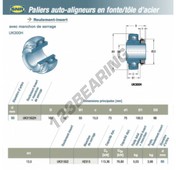 El Accesorio De Cojinete UK315-G2-H2315-SNR SNR mide 65 mm de diámetro interior, 160 mm de diámetro exterior y 42 mm de espesor. Está fabricado en .