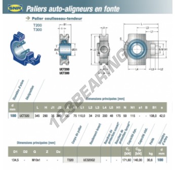 El Cojinete Hierro Fundido - 1 Fijación que se conoce por UCT320-SNR SNR tiene un diámetro interior de 100 mm. Esta referencia está hecha de hierro fundido y el tipo de sujeción es .