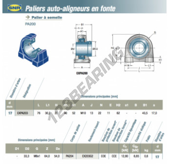 El Cojinete Hierro Fundido - 2 Fijaciones conocido como EXPA203-SNR SNR tiene un diámetro de eje de 17 mm y un espaciamiento de fijación de 52 mm. Esta referencia se produce en hierro fundido y el tipo de fijación es .