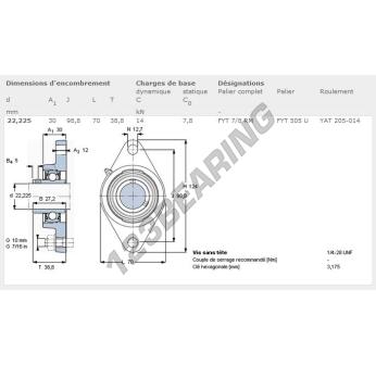 El Cojinete Hierro Fundido - 2 Fijaciones conocido como FYT7-8-RM-SKF SKF tiene un diámetro de eje de 22.23 mm y un espaciamiento de fijación de 98.8 mm. Esta referencia se produce en hierro fundido y el tipo de fijación es .