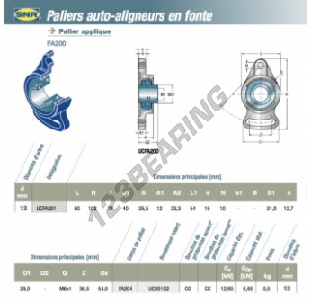 El Cojinete Hierro Fundido - 2 Fijaciones conocido como UCFA201-SNR SNR tiene un diámetro de eje de 12 mm y un espaciamiento de fijación de 78 mm. Esta referencia se produce en hierro fundido y el tipo de fijación es .