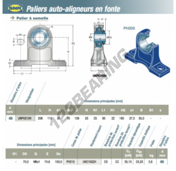 El Cojinete Hierro Fundido - 2 Fijaciones conocido como UKPH210H-SNR SNR tiene un diámetro de eje de 45 mm y un espaciamiento de fijación de 159 mm. Esta referencia se produce en hierro fundido y el tipo de fijación es .