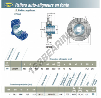 El Cojinete Hierro Fundido - 4 Fijaciones conocido como EXFC211-SNR SNR tiene un diámetro de eje de 55 mm y un espaciamiento de fijación de 150 mm. Esta referencia se produce en hierro fundido y el tipo de fijación es .