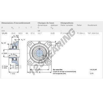El Cojinete Hierro Fundido - 4 Fijaciones conocido como FY3-4-RM-SKF SKF tiene un diámetro de eje de 19.05 mm y un espaciamiento de fijación de 63.5 mm. Esta referencia se produce en hierro fundido y el tipo de fijación es .