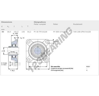 El Cojinete Hierro Fundido - 4 Fijaciones conocido como FY40-TF-VA228-SKF SKF tiene un diámetro de eje de 40 mm y un espaciamiento de fijación de 101.5 mm. Esta referencia se produce en hierro fundido y el tipo de fijación es .