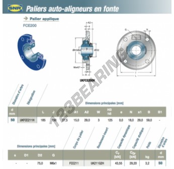 El Cojinete Hierro Fundido - 4 Fijaciones conocido como UKFCE211H-SNR SNR tiene un diámetro de eje de 50 mm y un espaciamiento de fijación de 150 mm. Esta referencia se produce en hierro fundido y el tipo de fijación es .