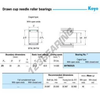 El Rodamiento De Agujas, conocido como BHTM2525-JTEKT JTEKT, tiene un diámetro interior de 25 mm, un diámetro exterior de 33 mm y un espesor de 25 mm.