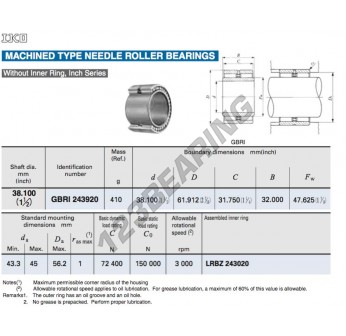 El Rodamiento De Agujas, conocido como GBRI243920-IKO IKO, tiene un diámetro interior de 38.1 mm, un diámetro exterior de 61.912 mm y un espesor de 32 mm.