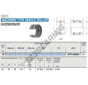 El Rodamiento De Agujas, conocido como GTR425630-IKO IKO, tiene un diámetro interior de 42 mm, un diámetro exterior de 56 mm y un espesor de 30 mm.