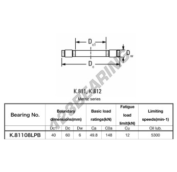 El Rodamiento De Agujas, conocido como K.81108LPB-JTEKT JTEKT, tiene un diámetro interior de 40 mm, un diámetro exterior de 60 mm y un espesor de 6 mm.
