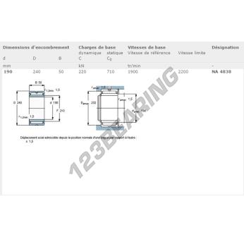 El Rodamiento De Agujas, conocido como NA4838-SKF SKF, tiene un diámetro interior de 190 mm, un diámetro exterior de 240 mm y un espesor de 50 mm.