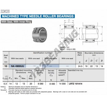 El Rodamiento De Agujas, conocido como NA4900-UU-IKO IKO, tiene un diámetro interior de 10 mm, un diámetro exterior de 22 mm y un espesor de 14 mm.