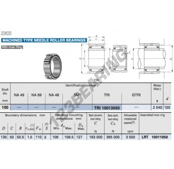El Rodamiento De Agujas, conocido como TRI10013550-IKO IKO, tiene un diámetro interior de 100 mm, un diámetro exterior de 135 mm y un espesor de 50 mm.