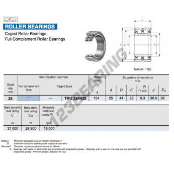 El Rodamiento De Agujas, conocido como TRU254425-IKO IKO, tiene un diámetro interior de 25 mm, un diámetro exterior de 44 mm y un espesor de 25 mm.