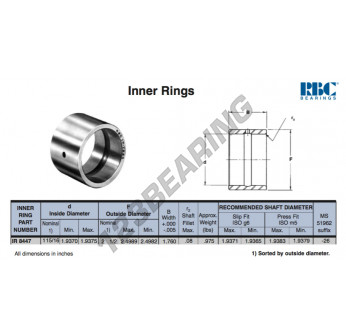 El Aro Interior conocido por la referencia IR8447-RBC RBC tiene un diámetro interior de 49.213 mm, un diámetro exterior de 63.5 mm y una longitud de 44.704 mm. Está hecho de .