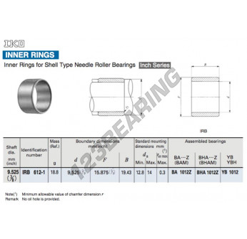El Aro Interior conocido por la referencia IRB612-1-IKO IKO tiene un diámetro interior de 9.525 mm, un diámetro exterior de 15.875 mm y una longitud de 19.43 mm. Está hecho de .