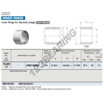 El Aro Interior conocido por la referencia LRBZ485632-IKO IKO tiene un diámetro interior de 76.2 mm, un diámetro exterior de 88.9 mm y una longitud de 51.05 mm. Está hecho de .