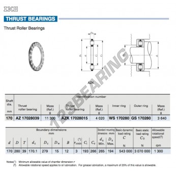El Rodamiento Axial De Agujas, conocido como AZK17028015-IKO IKO, tiene un diámetro interior de 170 mm, un diámetro exterior de 280 mm y un espesor de 15 mm.
