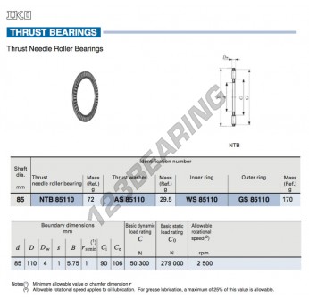 El Rodamiento Axial De Agujas, conocido como NTB85110-IKO IKO, tiene un diámetro interior de 85 mm, un diámetro exterior de 110 mm y un espesor de 4 mm.