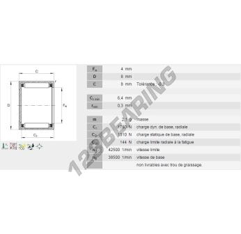El Buje De Agujas, conocido como BK0408-INA INA, tiene un diámetro interior de 4 mm, un diámetro exterior de 8 mm y un espesor de 8 mm.