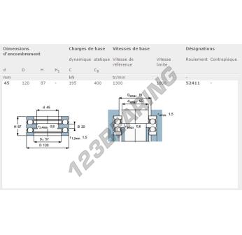 El Rodamiento Axial De Bollas, conocido como 52411-SKF SKF, tiene un diámetro interior de 45 mm, un diámetro exterior de 120 mm y un espesor de 87 mm.