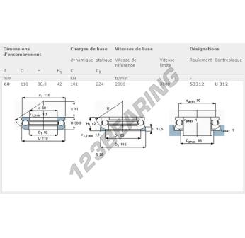 El Rodamiento Axial De Bollas, conocido como 53312-SKF SKF, tiene un diámetro interior de 60 mm, un diámetro exterior de 110 mm y un espesor de 38.3 mm.