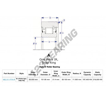 El Rodamiento De Guia, conocido como MG311-FFA-R-ENDURO ENDURO, tiene un diámetro interior de 55 mm, un diámetro exterior de 151.9 mm y un espesor de 38.1 mm.
