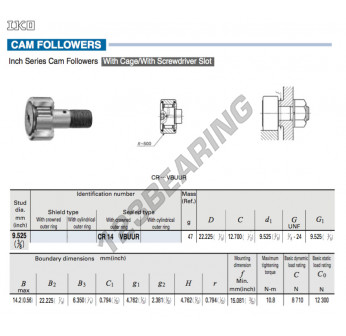 El Seguidor De Leva, conocido como CR14-VBUUR-IKO IKO, tiene un diámetro interior de 9.525 mm, un diámetro exterior de 22.225 mm y un espesor de 12.7 mm.