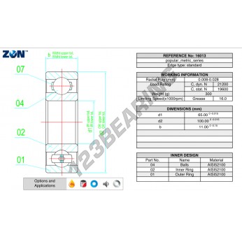 El Rodamiento De Bolas, conocido como 16013-ZEN ZEN, tiene un diámetro interior de 65 mm, un diámetro exterior de 100 mm y un espesor de 11 mm.