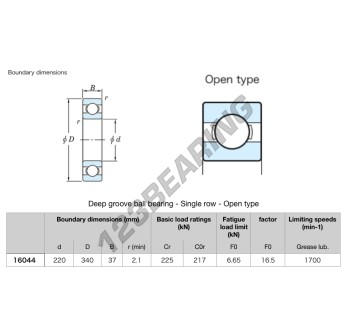 El Rodamiento De Bolas, conocido como 16044-JTEKT JTEKT, tiene un diámetro interior de 220 mm, un diámetro exterior de 340 mm y un espesor de 37 mm.