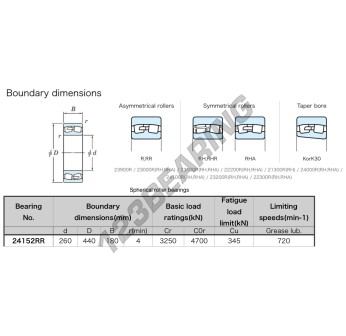 El Rodamiento De Bolas, conocido como 24152-RR-JTEKT JTEKT, tiene un diámetro interior de 260 mm, un diámetro exterior de 440 mm y un espesor de 180 mm.