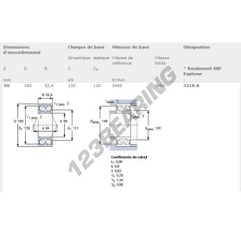 El Rodamiento De Bolas, conocido como 3218-A-SKF SKF, tiene un diámetro interior de 90 mm, un diámetro exterior de 160 mm y un espesor de 52.4 mm.