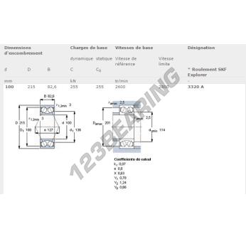El Rodamiento De Bolas, conocido como 3320-A-SKF SKF, tiene un diámetro interior de 100 mm, un diámetro exterior de 215 mm y un espesor de 82.6 mm.