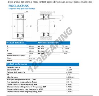 El Rodamiento De Bolas, conocido como 6009-LLU-CM-5K-NTN NTN, tiene un diámetro interior de 45 mm, un diámetro exterior de 75 mm y un espesor de 16 mm.