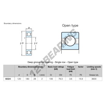 El Rodamiento De Bolas, conocido como 6024-JTEKT JTEKT, tiene un diámetro interior de 120 mm, un diámetro exterior de 180 mm y un espesor de 28 mm.