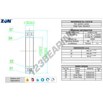 El Rodamiento De Bolas, conocido como 61872-M-ZEN ZEN, tiene un diámetro interior de 360 mm, un diámetro exterior de 420 mm y un espesor de 38 mm.