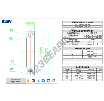 El Rodamiento De Bolas, conocido como 61892-M-ZEN ZEN, tiene un diámetro interior de 460 mm, un diámetro exterior de 480 mm y un espesor de 56 mm.