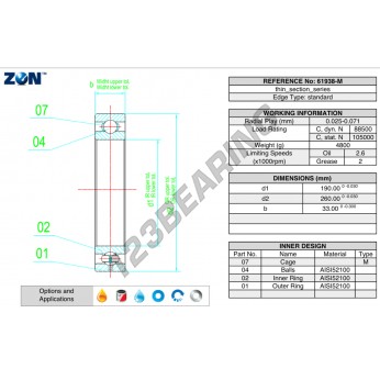 El Rodamiento De Bolas, conocido como 61938-M-ZEN ZEN, tiene un diámetro interior de 190 mm, un diámetro exterior de 260 mm y un espesor de 33 mm.