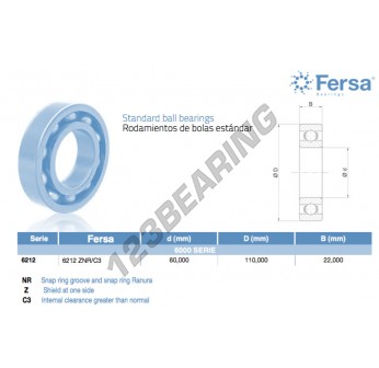 El Rodamiento De Bolas, conocido como 6212-Z-NR-C3-ASFERSA ASFERSA, tiene un diámetro interior de 60 mm, un diámetro exterior de 110 mm y un espesor de 22 mm.